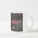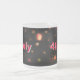 Fireworks. Fira Independence day med den 4 juli i mugg. Bakgrund till exploderande fyrverkerier mot svarta himlar. "4 juli" står i rött med blå skugga.