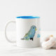 Blåfåglar som önskar dig en bra dag. Två virkade fåglar ansikte varandra. I mitten finns en blå text med texten "Ha en bra day" (kan ändras).