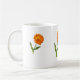 Orange calendula blomma med regndroppar på petaler, grönt och löv.