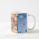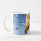 Mugg för foto för god julmoster beställnings- i stilfullt blått- och vitsnowflakemönster med anpassadetext och fotoet, perfekt som en helgdaggåva.