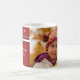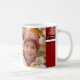 Mugg för foto för god julmoster beställnings- i stilfullt röd och vitsnowflakemönster med anpassadetext och fotoet, perfekt som en helgdaggåva.