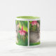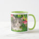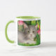En mycket liten grå färg- och vitkattunge gömmer amongst några fuchsia blommor. Konstverk av Carmen Medlin.