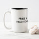 Logotyp på bekläda med "först i tjänste-" och på baksidaen det något att säga, "pride & tradition!",