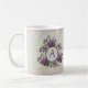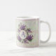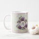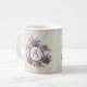 Grenar av den keramiska muggen för lilamedaljongmonogram på en marmorerad pastellfärgad färgbakgrund. Monogramen förläggas på höger och vänster sida. Den kan ändras till singelmonogramen i centrera
