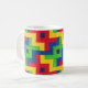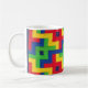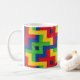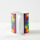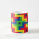 En vitkaffemugg med en färgrik abstrakt design från ett patchworkkåta-täcke av Judy Adamson.