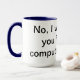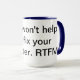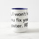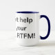 Mugg för vit 15oz med den blåtthandtaget och kanten. Har texten "inte, mig ska inte hjälp som du fixar din dator. RTFM!", Detta kommer från att vara ett mycket frustrerat ledar- för webben som designeras involuntarily DET service.