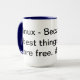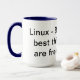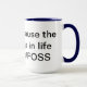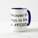 mugg för kaffe 15oz, vit med blåtthandtaget och kant. Linuxen har för texten "- därför att de bäst sakerna i liv är fria. #FOSS". #FOSSstativ för fri och öppen källsoftware. Linuxen är ett alternativt fungeringssystem för datorer. Vanligt inkluderar versioner Ubuntu, fedoraen och minten som är den fria och öppna källan.