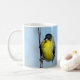 Gult med svart huvud. Den här fågeln är redo att träffa lodrät gren. Blå himmel utgör en bakgrund.