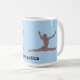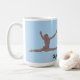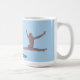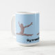 Gymnast som hoppar genom luften. Fotografiet är ändrat för att se ut som terrakotta i basrelief. Bilden dupliceras på varje sida av muggen. Färgen är en rosa-lila, eller mauve, med en ljusblå bakgrund. "Gymnastik" är centrerad längst ner.