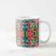Blommor i kalejdoskopiska mönster. Rosa och rödblommor med grönt löv på bakgrunden av mörk blått grönt. Bilden ställs in i speglad ruta mönster. Från silke-målning från Susan Lilly. (Lilikai)