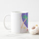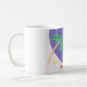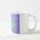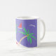 Detta klassiska vita mugg är designat med en strand- eller öscen i handflatan träd, paraplyer, blått vatten och en röd segelbåt.