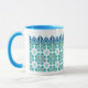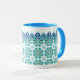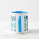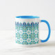 Det här fantastiska mugg har ett blått inuti och handtag och en tunn plattform på utsidan med blå och turkos. Denna design har sitt ursprung i en faktisk platta av Oregon Tile maker Fay Jones Day.