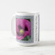 Få en underbar start med ett kaffe mugg som innehåller ett inspirerande budskap och foton av magentor omgivna av gräns som är gjorda av det unika mönster som finns i träd-bark.