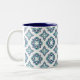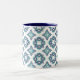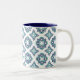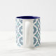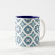 Det här söt kaffet eller teet mugg har ett land-lantbruk. Insidan är marin blå. Konstruktionen är marinfärgad och turkotisk färgutskrift på vit bakgrund. Konstruktionen kommer från en ursprunglig bricka av Oregon-platttillverkare, Fay Jones Day