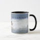 Mugg med en bild av människor som leker i vågar på stranden. Ord på mugg är "Jag skulle hellre vara på stranden".