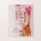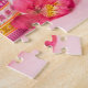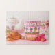 Muggen med tea, gifflet och alstroemeria blommar över rosa tablecloth; med tekannan fokuserar tin och blommor ut ur i bakgrunden.