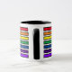Regnbågens färger fyller i de svarta konturerna av jämnt fördelade staplar, från röd längst upp till violett längst ner. Vit mugg syns genom mellanrummen.
