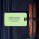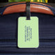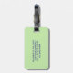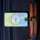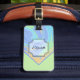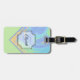 På framsidan av bagagetaggen finns en färglös färgskiftning av persikor, grönt, blått och violett längs överkanten av mönstret med en skylt över brev och namn. Grund och bak är en grönt som plockas från strömmen. Fyll i mallens fält för fram- och baktext eller klicka på anpassa om du vill markera ett teckensnitt stil, storlekt och färg.