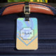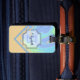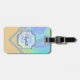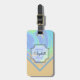 På framsidan av bagagetaggen finns en färglös färgskiftning av persikor, grönt, blått och violett längs överkanten av mönstret med en skylt över brev och namn. Grund och bak plockas färg från strömmen. Fyll i mallens fält för fram- och baktext eller klicka på anpassa om du vill markera ett teckensnitt stil, storlekt och färg.