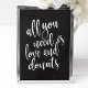 En elegant och modern brölloppsskylt med texten "Allt du behöver är kärlek och munkar" i en utåtriktad scriptfont, borststrukturen ger en spontan och lekfull känsla. Bakgrundsfärgen kan anpassas efter dina behov och önskemål, vänligen kontakta mig om du har några speciella önskemål.