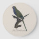 Denna eleganta illustration avbildar munkparakiten, även allmänt känd som munkpapegojan eller Quakerpapegojan, en liten men mycket anpassningsbar papegoja som härstammar från Sydamerika. Iögonfallande med sin livfulla gröna fjäderdräkt, ljusgrå bröst och lång, avsmalnande stjärt, har denna art blivit en av de mest framgångsrika fågelkolonisatörerna utanför sitt ursprungliga utbredningsområde. Förvildade populationer frodas nu i delar av Nordamerika och Europa, tack vare deras anmärkningsvärda motståndskraft och sociala beteende. Munkparakiter är också unika bland papegojor genom att bygga stora gemensamma pinnbon, ofta med flera par i en enda struktur.