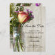 Spara datuminbjudan. Klar glasmurbrukskrukefoto med en röd och gul ros, och lila, vita och gula vildblommor. Ett vackert tema för ett naturligt, sommar, utomhus vintagebröllop. Sommarens vilda trädgårdstema, med ljust vitkalkade träplankor i bakgrunden. Alla mönster Copyright © www.CustomInvitesOnline.com