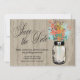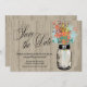 Masonburk Save the Date: Perfekt för en landsbygdbröllop eller kanske du bara älskar Masonburkar! Gammal vintage Masonburk med färgerna Ljusblå, Teal, Brun, Korall och Mustargul vilda blommor. En Ljus Tan Lada Trä Bakgrund är inställd. Om du har några frågor om denna design eller vill ha en färgförändring, vänligen mejla mig paula@labellarue.com VÄLJ DITT PAPPER: Detta är inställt för att skrivas ut på Basic men du kan välja en alternativ kartong.