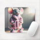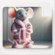 En söt, antropomorfisk mus står i mjuk belysning med fluffy rosa robe och matchande tofflor med blommor