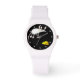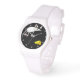 Lustigt tecknad, vit mus med rosa fötter och öron, som läcker ut i luft över en orange kilo ost. Svart bakgrund med vita punkter. Ha roligt över tiden med den här söta armklockan!