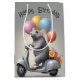 Cute grått-mus med party-ballonger och blombukett på en grått-scooter. Text kan redigeras.