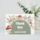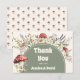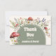 Mushroom Baby Shower Thank You Card with a forest mushrooms themed baby shower design, featuring whimsical watercolor toadstool mushrooms, wildflowers, lavender, and soft greenery around an earthy sage arch. This whimsical, cute, Earthy Baby Shower thank you card is perfect for expressing gratitude after a woodland/forest, boho rustic, or enchanted garden celebration. Personalized names and wording create a cohesive look that matches coordinating mushroom baby shower invitations and stationery.