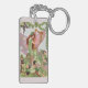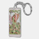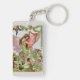 vintage fairylands illustrative painting with a beautiful lady faery with long reddish brown curly hair in a long green dress covered in clovers, large pink butterfly style wings, and clovers in her hair playing a large golden harp as tiny girl fairies and leprechaun faeries with green coats and black top hats dancing around in a circle.