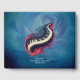 Music in motion, the curved piano. The keyboard consists of classic white and black keys, clearly separated from each other and set against a dark frame. This frame creates an elegant contrast and highlights the keys. A dynamic, artistic element unfolds around the keyboard: flowing shapes in vibrant red, purple, and gray tones seem to creep out from the keyboard or surround it. These shapes are curved and organically designed.