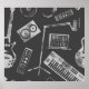 Vintagens musikproduktion sömlös mönster. Högtalare, bärbar dator, hörlurar, mikrofon, förstärkare, plåt, syntesare, elektrisk gitarr. Musikproduktion konst i återflöde. Groove med klassikerna på nytt. Byt ut musikscenen med en vintage mönster av instrument och redskap. musik, mönster, produktion, sömlös, dj, vintage, illustration, piano, gitarr, symbol, mikrofon, tangentbord, ljud, rekord, utrustning, bakgrund, silhouette, förstärkare, audio, grunge