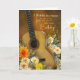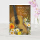 This belated birthday card is designed specifically for guitar players, musicians, and music lovers, featuring a warm instrumental theme. The front cover shows a classical guitar surrounded by blooming yellow, white, and orange flowers, set against a textured golden-brown background that gives it a rich, earthy, artistic look. The cover text reads: