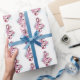 Pink treble clef with delicate, detailed pink Japanese cherry blossoms against white background painted over with light blue paint. Blooming pink sakura.