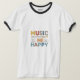 T-shirt har ett glatt budskap till musiken älskare. "Music Makes Me Lycklig" visas i en pulserande multifärgad. Varje ord skulle kunna vara ett annat ljust och glatt färg och betona den upplyftande känslan av musik. Föreställ dig "Musik" i en vibrerande blått, "Makes" i en solig gult och "Lycklig" i en lekfull rosa, som skapar en design som firar musikalisk glädje.