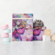 Färgglad, fantasifull, rolig rosa clown som spelar trumpet med en uttrycksfull uggla och glada noter, blommor, blad i livfulla röda, fuchsia, violetta, lila, blå, vita färger, akvarellmålning av Bulgan Lumini (c)