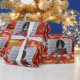 En stängsel av en Music Bok Box med en blå kyrka i Mitten, det är sitta på Julklapp under Julgran. Det är ljust och färglöst. I Hutchinson Kansas USA. Det är på julafton Papper.