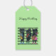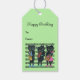 De här presentmärkena har tre svarta musikaliska katter som spelar musikinstrument på svart musik med rosa, gröna och blå kläder på en ljusgrön bakgrund. Anpassa texten längst fram och tillbaka med mallarna.