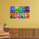 Ljusa färger lägger till en modern popkonsanda i det här porträtten av berömd musikkompositörer. Varje porträtt är designat och har två olika intensiva färg och konstnärerna först namn placerade i ett fet, rent teckensnitt. Åtta kompositörer finns med: Chopin, Bach, Wagner, Schubert, Tchaikovsky, Shostakovich, Mozart och Beethoven. Öga-fångst, contemporary och unikt!