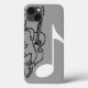En grafisk design av en vit musikanteckning och en man som spelar saxofon, och andra instrument - gråttets bakgrund kan ändras ("anpassad"-knapp).