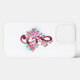 Rosan tredubblar klafen med finskalig, detaljerad rosa japansk körsbärsfärg mot vit bakgrund som är målad med ljusblå blommar. Blåser rosa sakura.