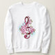 Rosan tredubblar klafen med finskalig, detaljerad rosa japansk körsbärsfärg mot vit bakgrund som är målad med ljusblå blommar. Blåser rosa sakura.