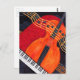 Musikpersonal och noter flyter över en cell och piano i intensiva och guld. Tangentbord står i kontrast till den djärva bakgrunden till färger och mörk.