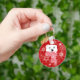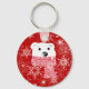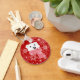 Polarna bär munstycke i en röd platta på en röd bakgrund med vitt snöflingor.