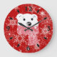 Polarna bär munstycke i en röd platta på en röd bakgrund med vitt snöflingor.