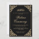 Ett lyxsvart färg-kort med information om deltagande i den muslimska bridens och brudgummens islamiska Walimceremoni efter deras shaadi. Elegant, typsnitt för det klassiska guld-skriptet skrivet överst och en rulla som segrar över vintagen i hörnet av gräns. Använda alternativet "Anpassa" på högerna om du vill ändra informationen om händelsen i giftermål. HennesLineForDesign av Ayesha A.Hussain.
