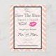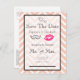 Ett modernt stiligt bröllop spara datumet-kort med rosa kyssiga läppar och en retro-inspirerad mustasch-illustration. Placerad på en ferskansonad bakgrund. Anpassa med din bröllopsinformation på framsidan och baksidan.