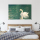 En serenbild har en vit mute svan som på ett snyggt sätt glider på en kropp av vatten. Svan nacke är böjt i en klassisk S-form, och dess reflektion syns i vatten. Vatten är en förändrad grönt färg, vilket tyder på en naturlig miljö. Bakgrunden är suddig, vilket tyder på ett ytligt djup i fält, som är inriktat på svan. Den allmänna stämningen är fredlig och lugn.